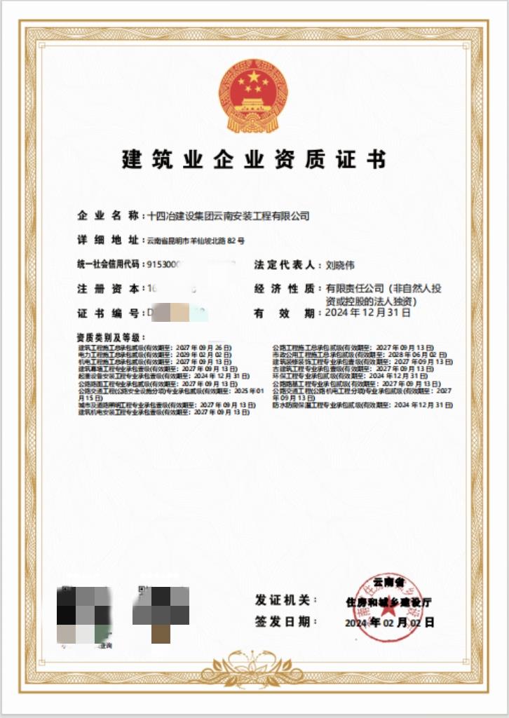 2月2日,云南省住房和城乡建设厅发布资质核准公告,公司顺利取得电力工程施工总承包贰级资质。